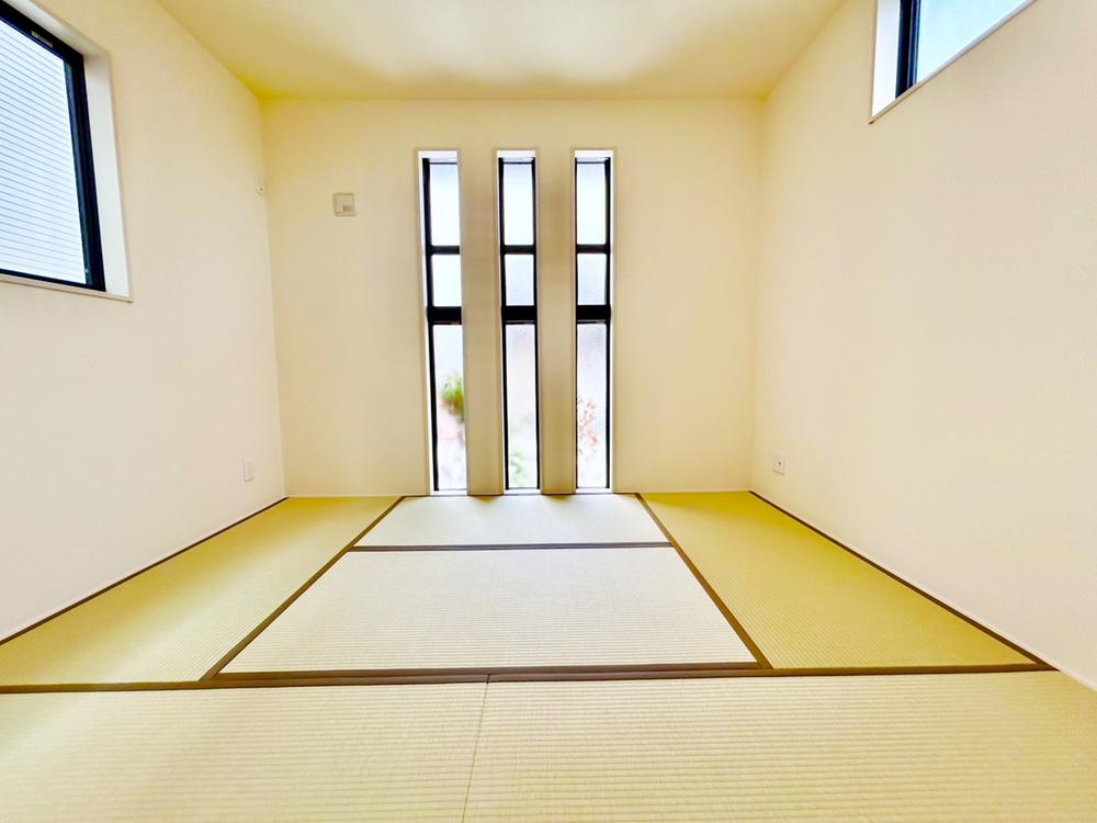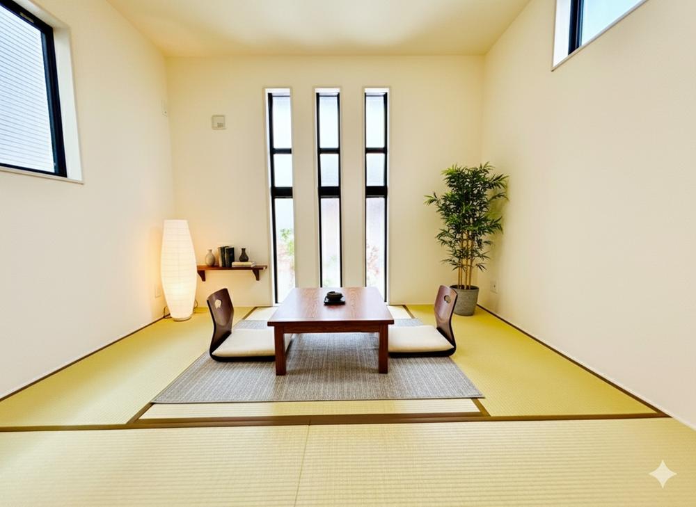 ◆和室◆ときにはゆったりと畳の上で過ごしたいものです。陽光が照らし出す青畳が美しい和室です。リビング併設の和室は使い勝手◎(CGにて、家具等の配置をしております。なお家具等は販売価格には含まれておりませ