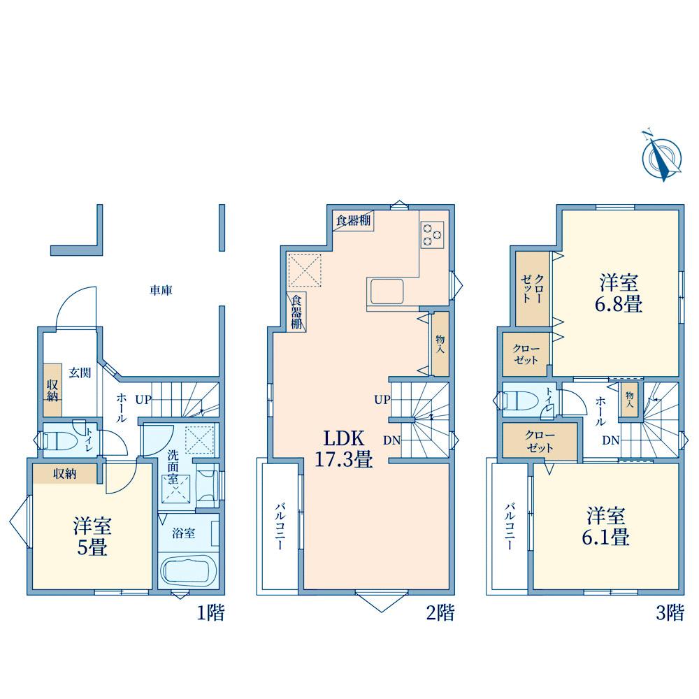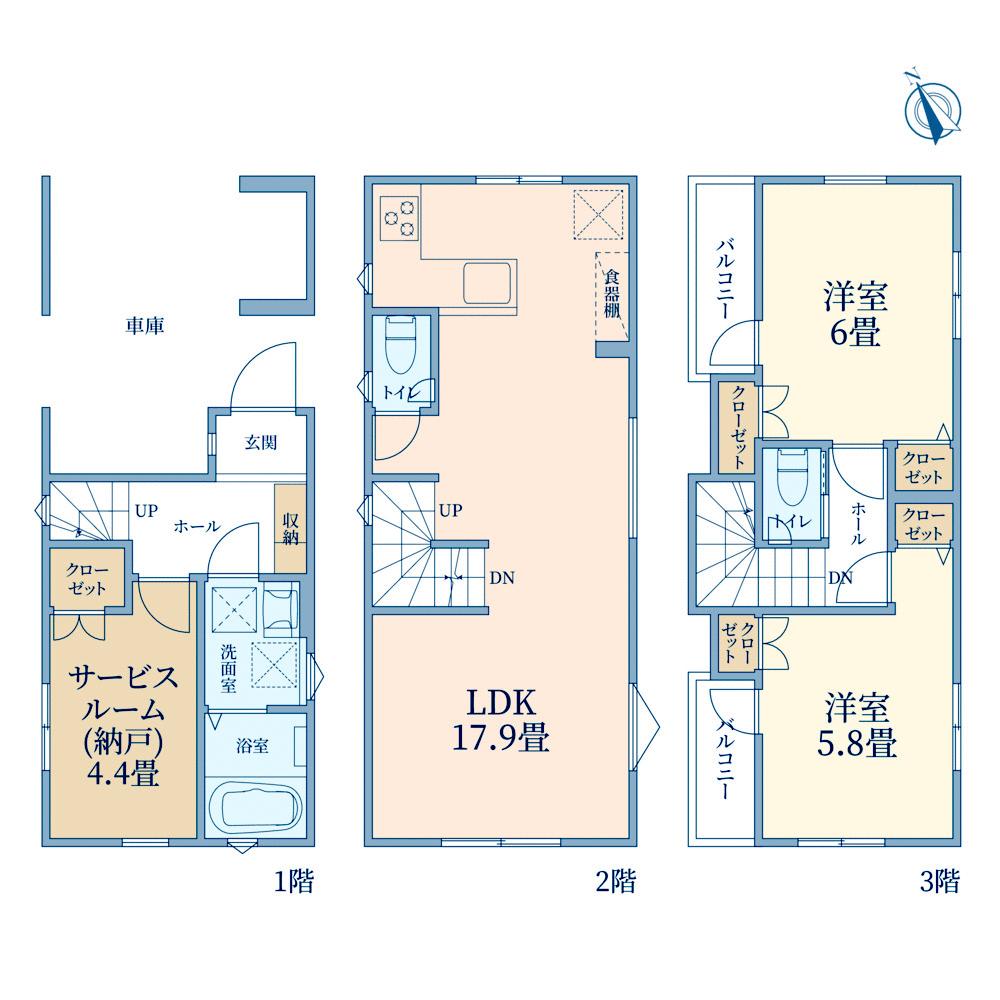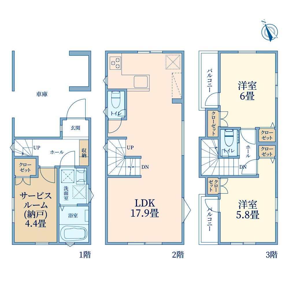B号棟間取り図:17.9帖のゆとりのあるLDKを通りからの人目を気にせず寛げる2階に設計しました。3階に設けた2ヶ所のバルコニーはお部屋に奥行きを演出!お洗濯物やお布団を分けて干せるのも嬉しいですね。