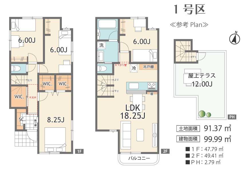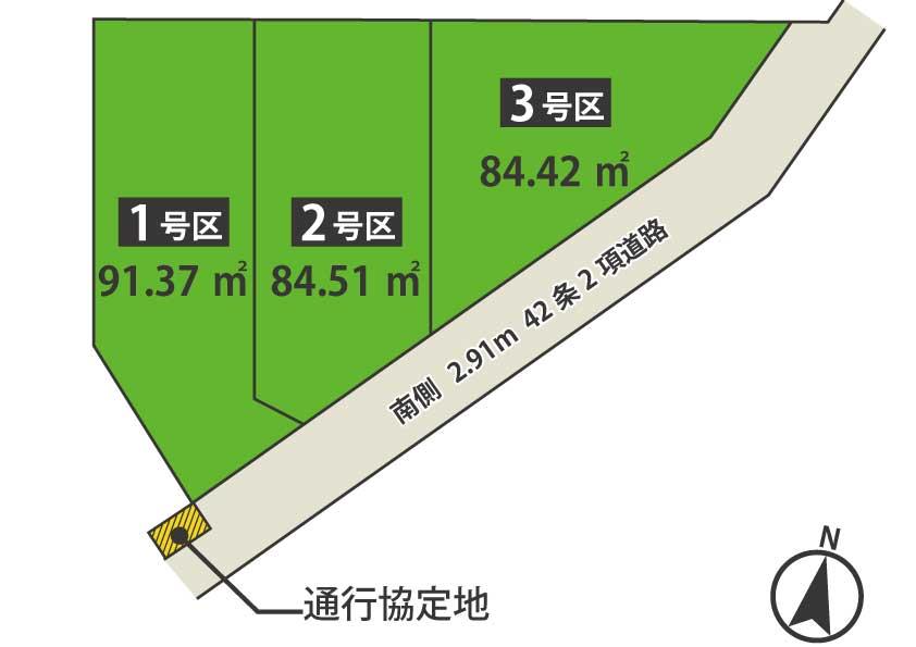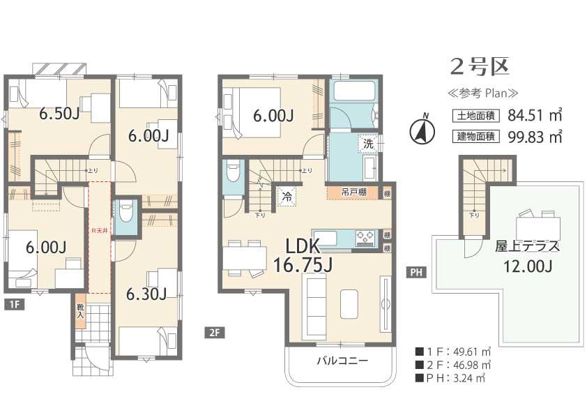 | 建物面積 | 94.96㎡~99.99㎡(28.72坪~30.24坪)(実測) | 土地面積 | 84.42㎡~91.37㎡(25.53坪~27.63坪)(実測) | ||