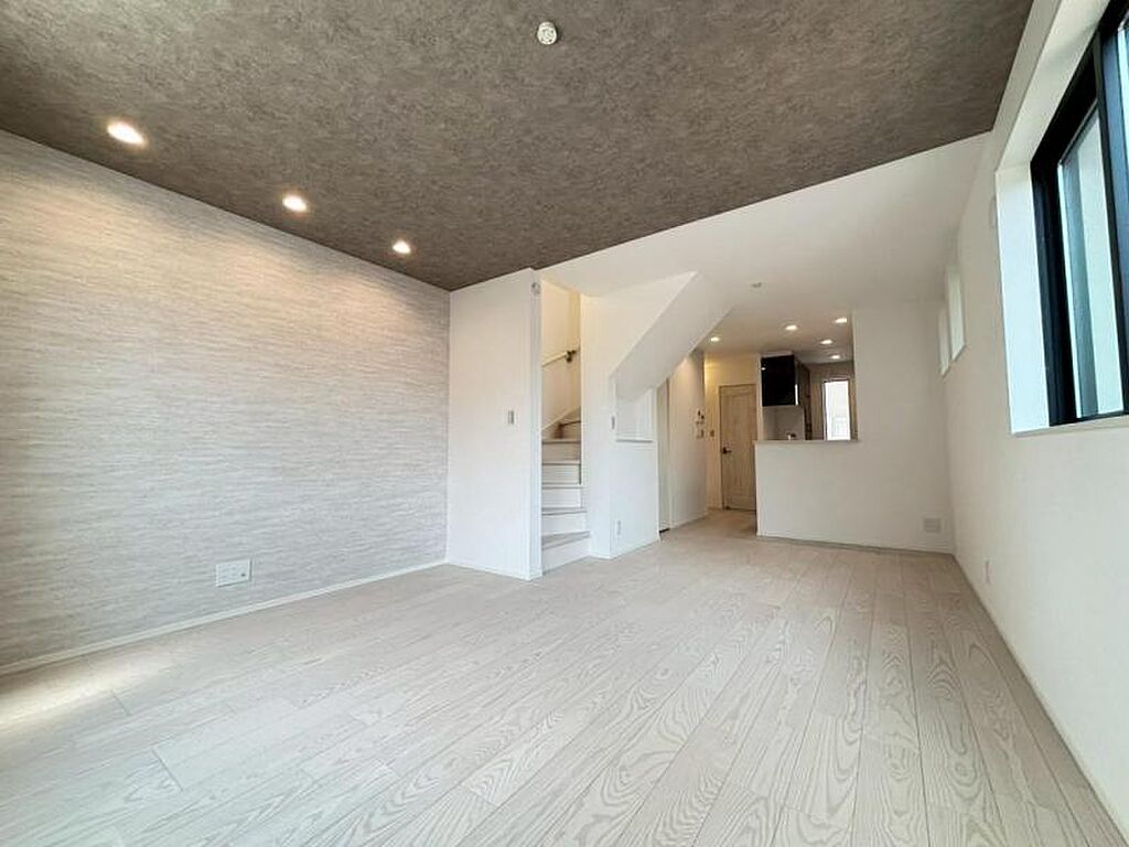 約17帖のゆったりとしたリビングです。明るさと風が入る窓配置が安らげる空間を演出します。