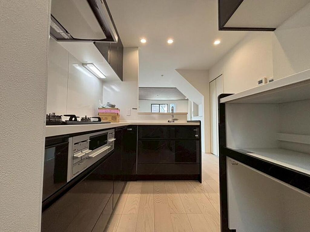 焼いたり煮たりと一度にたくさんのお料理を作ることのできる便利な3口コンロがついたシステムキッチンは豊富な収納と食洗機付き。食後の片づけが楽になるからママの自分時間が増えてにこにこ。
