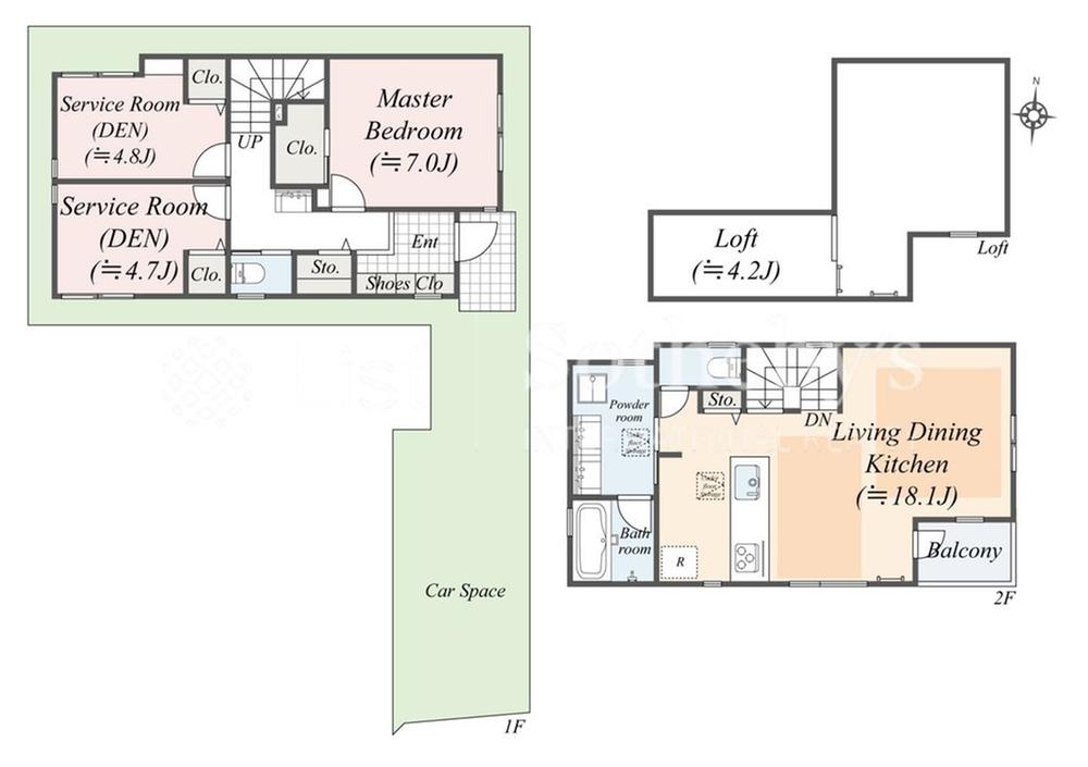 建物面積 | 87.62㎡・90.66㎡(26.50坪・27.42坪) | 土地面積 | 89.6㎡・95.2㎡(27.10坪・28.79坪) | ||