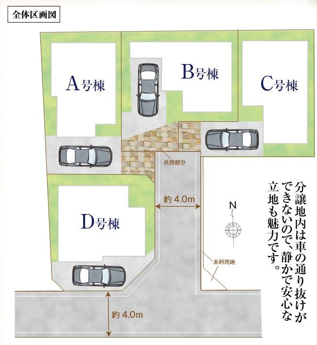 地目 | 宅地 | 道路付け | 道路幅:4m、アスファルト舗装、南側約4.0m公道(法42条1項1号)、分譲地内約4.0m(法42条1項5号)、私道持分有:分譲地内道路 | ||