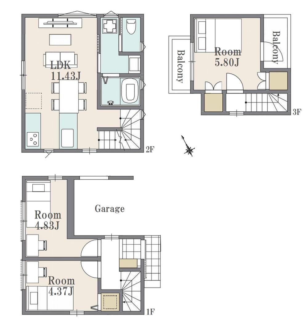 | 建物面積 | 69.14㎡(20.91坪)、うち1階車庫7.23㎡ | 土地面積 | 44.47㎡(13.45坪) | ||
