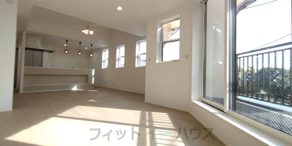 東南角で陽当り抜群。約20帖のLDKは勾配天井で開放感あります。