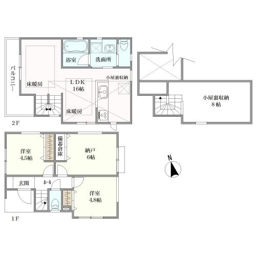 | 設備 | 2沿線以上利用可 / スーパー 徒歩10分以内 / 浴室乾燥機 / LDK15畳以上 / 対面式キッチン / トイレ2ヶ所 / 2階建 / 浴室に窓 / TVモニタ付インターホン / 都市ガス / 屋根裏収納 / 床暖房 | ||||