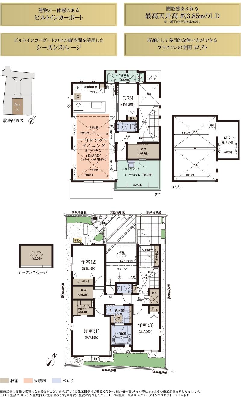 | 備考 | 設備:汚水雨水合流方式 お引き渡し後に電気・ガス会社については、お客様の選択・ご契約が必要となります。、建築確認番号:SJK-KX245513660、カースペース(全戸) ※うち、ビルトイカーポート1戸/建物面積補足:100.70㎡~116.32㎡ビルトインカーポート面積11.17㎡含む /【建築物省エネ法に基づく省エネ性能】①対象区画:No.1~No.5、②エネルギー消費性能:星5~星6、③断熱性能:5、④ZEH水準:該当有り、⑤ネット・ゼロ・エネルギー:該当有り 、:⑥目安光熱費:なし、⑦再エネ設備:あり/※「交通」に表示する最寄駅など所要時間は本物件販売総戸数に対応した内容です。※「交通」に表示する最寄駅など所要時間は本物件販売総戸数に対応した内容です。販売対象の所要時間は以下のとおりです。 ※今期販売対象区画:No.3 最寄り駅所要時間 徒歩9分(No.3) | ||||