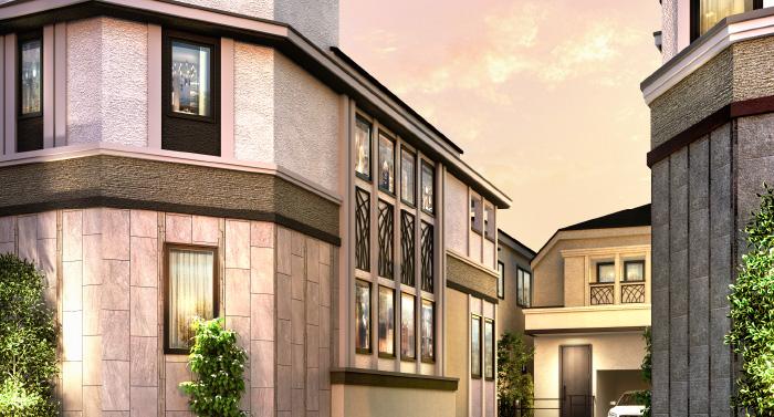 東・西側どちらからのアプローチでも、最初に見える部分を街区の顔として意識し、コーナータイルやコーナーウォール、門扉を採用。周囲とは一線を画す結界性を演出しています。※完成予想CG(No.5)