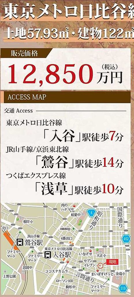 東京メトロ日比谷線「入谷」駅 徒歩7分 JR山手線「鶯谷」駅 徒歩14分 つくばエクスプレス「浅草」駅 徒歩10分 | ||||