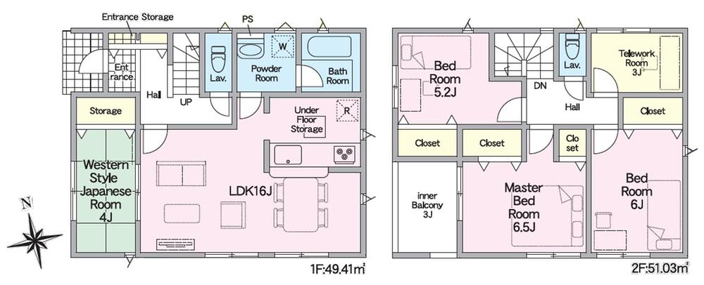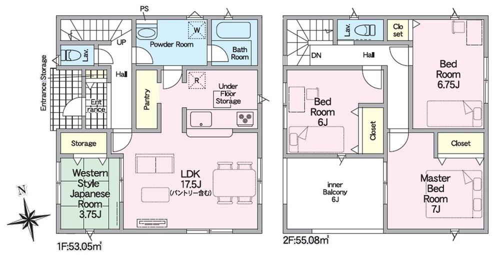 | 建物面積 | 100.44㎡・108.13㎡(30.38坪・32.70坪) | 土地面積 | 173.35㎡・176.69㎡(52.43坪・53.44坪) | ||
