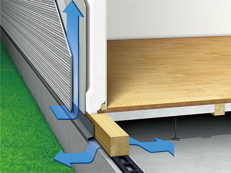 外壁材と構造躯体の間に外気が流れる通気層をつくることで、湿気を外部に放出。壁内の通気層は屋根裏まで通っており、結露や湿気を少なくすることで、構造体や断熱材を腐食やカビから守り、建物の耐久性を向上させます。