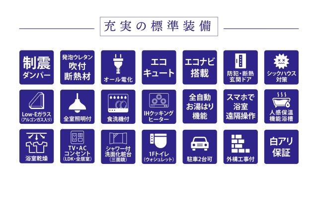 | 設備 | 長期優良住宅認定通知書 / 駐車2台可 / スーパー 徒歩10分以内 / システムキッチン / 浴室乾燥機 / 全居室収納 / LDK15畳以上 / 和室 / シャワー付洗面化粧台 / 対面式キッチン / 浴室1坪以上 / 2階建 / オートバス / 温水洗浄便座 / 床下収納 / TVモニタ付インターホン / ウォークインクローゼット / IHクッキングヒーター / 小学校 徒歩10分以内 / 食器洗乾燥機 / オール電化 | ||||