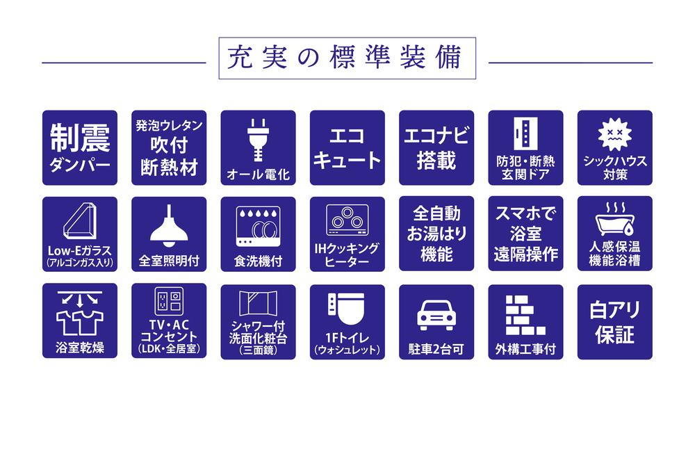 設備 | 長期優良住宅認定通知書 / 駐車2台可 / LDK18畳以上 / スーパー 徒歩10分以内 / システムキッチン / 浴室乾燥機 / 全居室収納 / 前道6m以上 / シャワー付洗面化粧台 / 対面式キッチン / トイレ2ヶ所 / 浴室1坪以上 / 2階建 / オートバス / 温水洗浄便座 / 床下収納 / IHクッキングヒーター / シューズインクローク / 食器洗乾燥機 / オール電化 | ||||