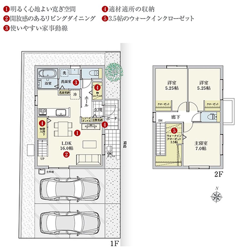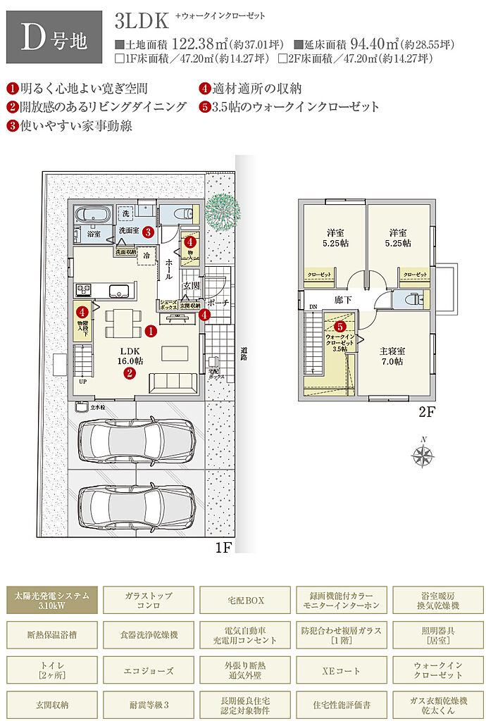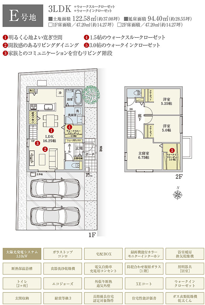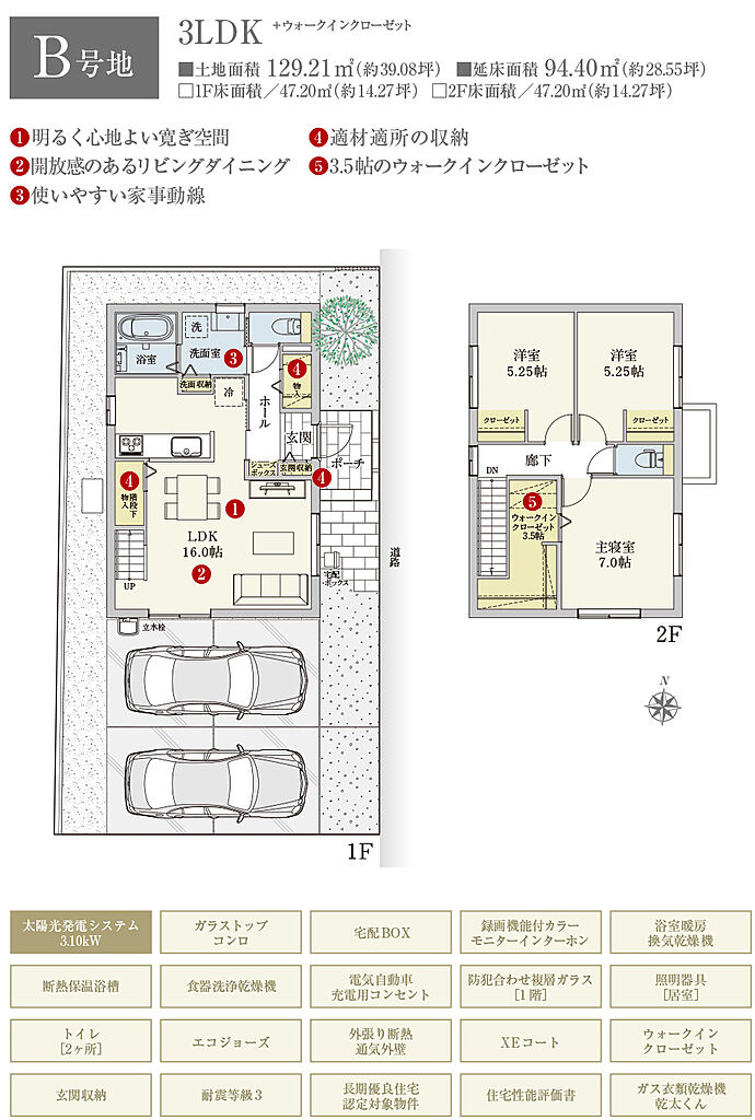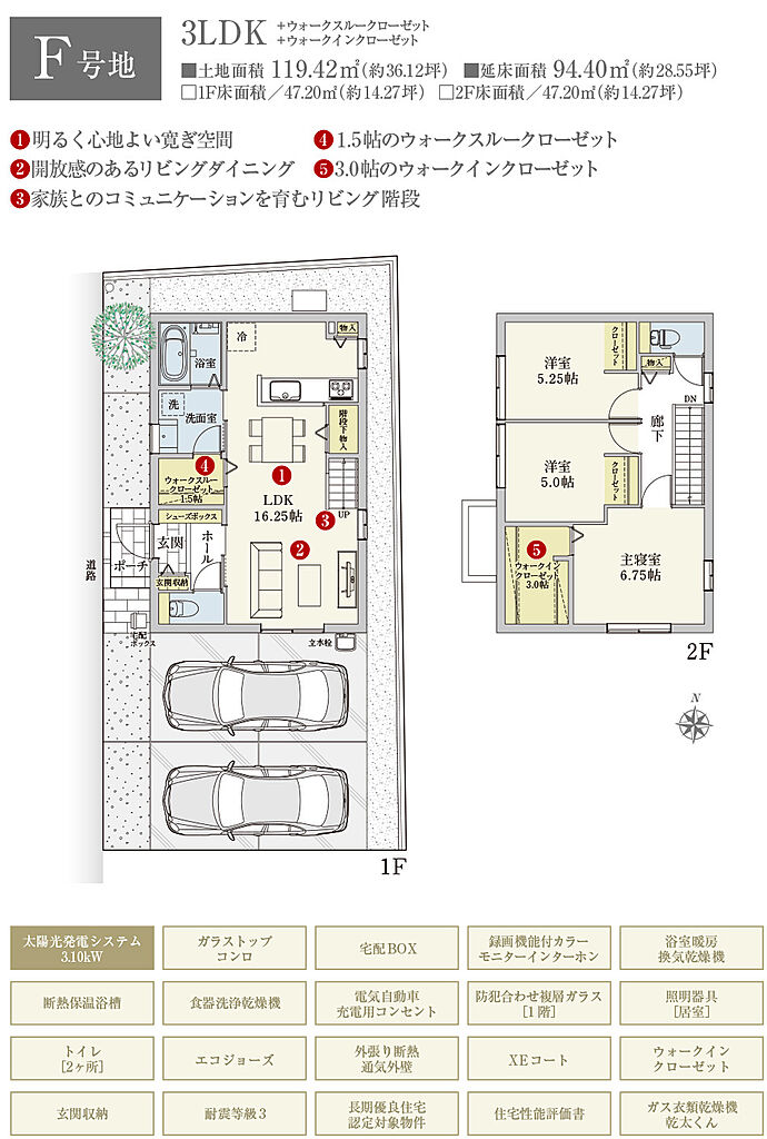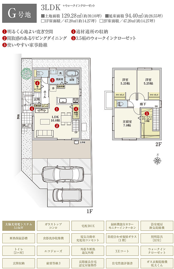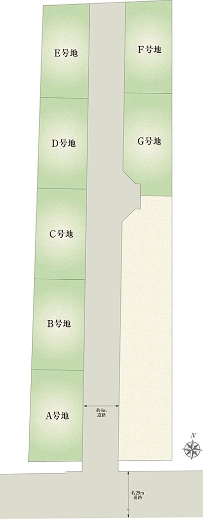 | 建物面積 | 94.40m2(B号地、C号地、D号地、E号地、F号地、G号地)~96.14m2(A号地) | 土地面積 | 119.42m2(F号地)~133.79m2(A号地) 全て私道負担なし | ||