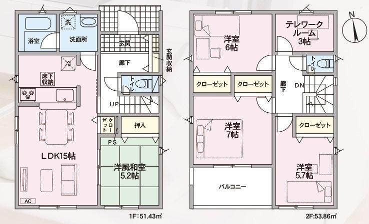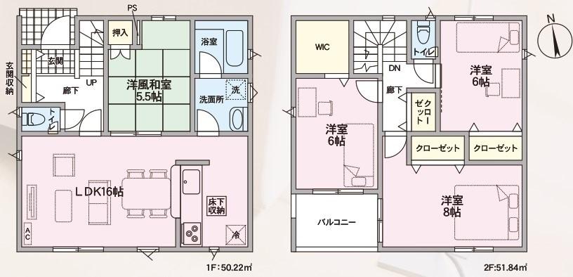 | 建物面積 | 102.06㎡・105.29㎡(30.87坪・31.85坪) | 土地面積 | 211.14㎡・215.09㎡(63.86坪・65.06坪) | ||