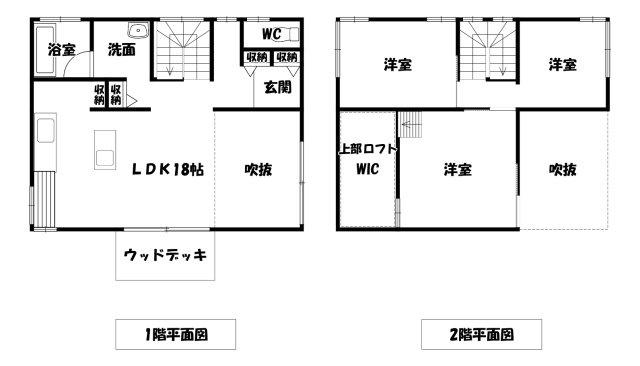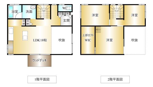 | 設備 | 駐車3台以上可 / LDK20畳以上 / 前道6m以上 / 庭 / シャワー付洗面化粧台 / 2階建 / 東南向き / 温水洗浄便座 / ロフト / 浴室に窓 / 吹抜け / TVモニタ付インターホン / ウッドデッキ / ウォークインクローゼット / IHクッキングヒーター | ||||