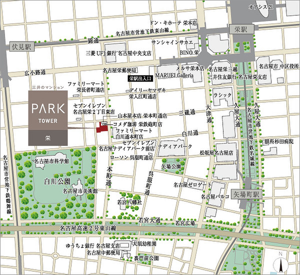 名古屋市営東山線「栄」駅 徒歩10分 名古屋市営東山線「伏見」駅 徒歩8分 名古屋市営名城線「矢場町」駅 徒歩9分 | ||||