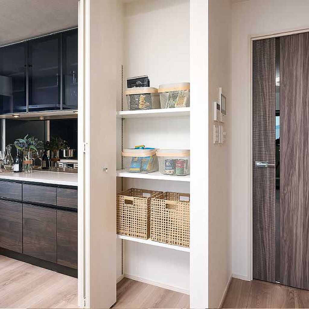 家事室としても使える大型パントリーキッチンに設けたパントリーは、買置き品や保存食、大型の調理器具などをたっぷり収納できます。キッチンをすっきり美しく保てる工夫のひとつです。(A・B・Eタイプ)