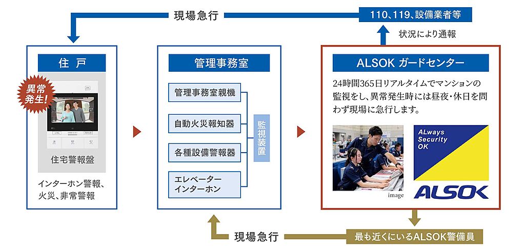 各住戸は、管理室の他、セキュリティ会社とも24時間結ばれ、緊急時にはインターホンのボタンを押して通報できます。通報を受けたセキュリティ会社は、必要に応じて直ちに関連機関に迅速な対応を促し、家族の安全を守ります。