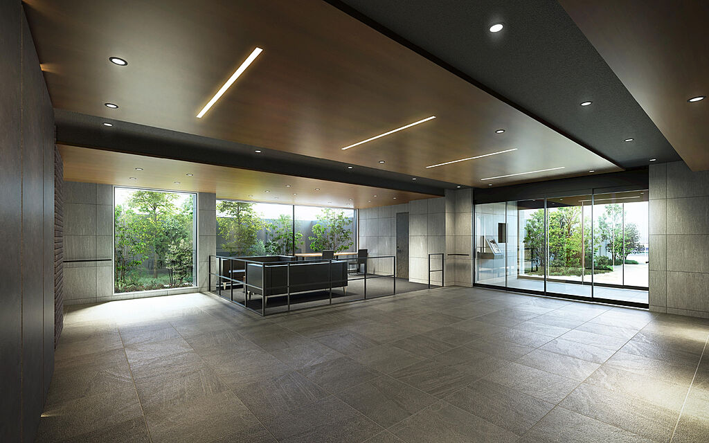 大きなガラス窓を通して光を採り込むエントランスホール。石目調や木調のマテリアルを使い、落ち着いたテイストでまとめられ、ラグジュアリーなホテルを思わせるような、上質な雰囲気に満ちています。
