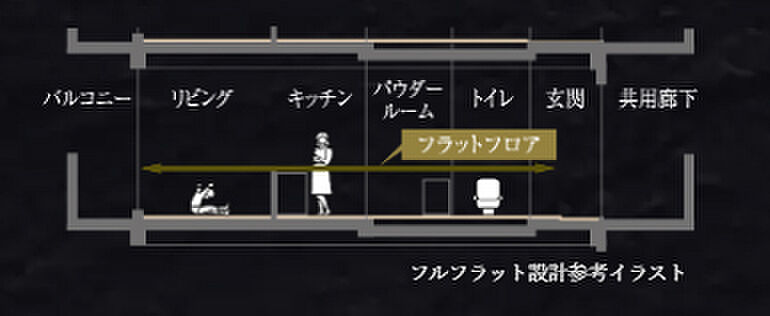 廊下から居室に入る際に床に段差がないとつまずく心配がなくて安心。そんなフラットフロア設計をキッチン、洗面などの水廻りまで展開し、住戸内をフルフラットに。掃除や家具の移動もスムーズになり、小さなお子さまやご高齢の方にも優しい安心の住まいが実現します。(玄関及びサッシ立上りは除きます。)
