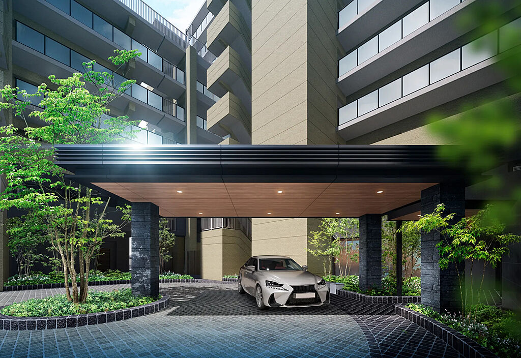 大規模レジデンスとしての品格と風格を纏いながらも、低層住宅が並ぶ街並みにやさしく寄り添う造形美。アースカラーを基調とした落ち着きある3棟が景観に溶け込み、陽光に映えるガラス手摺を採用することで、全方位に美しい印象を宿しました。