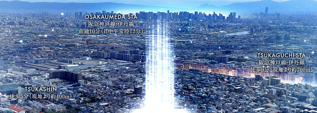 再開発によってさらなる進化が期待される阪急「塚口」駅界隈。商業施設「グンゼタウンセンターつかしん」(徒歩5分/現地より約400m)の賑わいを抱き、「大阪梅田」駅へは約11分という優れたアクセスを誇ります。都市の躍動が日常に溶け込むこの地に、三棟が重なり合いながら描き出すのは、単なる集合体ではなく、都市に奥行きをもたらす“風景”そのもの。高級感と重厚感を纏い、静かに、そして堂々と佇むその姿は、家路をたどる電車の車窓から、誇らしく出迎えてくれることでしょう。
