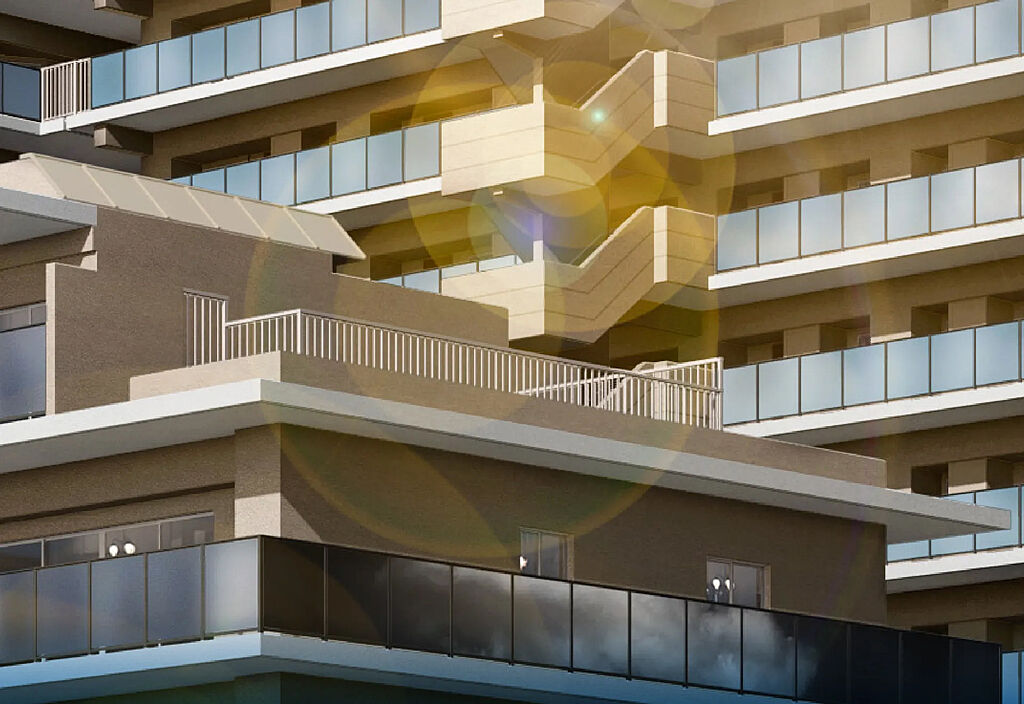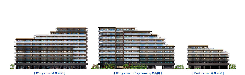 大規模レジデンスとしての品格と風格を纏いながらも、低層住宅が並ぶ街並みにやさしく寄り添う造形美。アースカラーを基調とした落ち着きある3棟が景観に溶け込み、陽光に映えるガラス手摺を採用することで、全方位に美しい印象を宿しました。