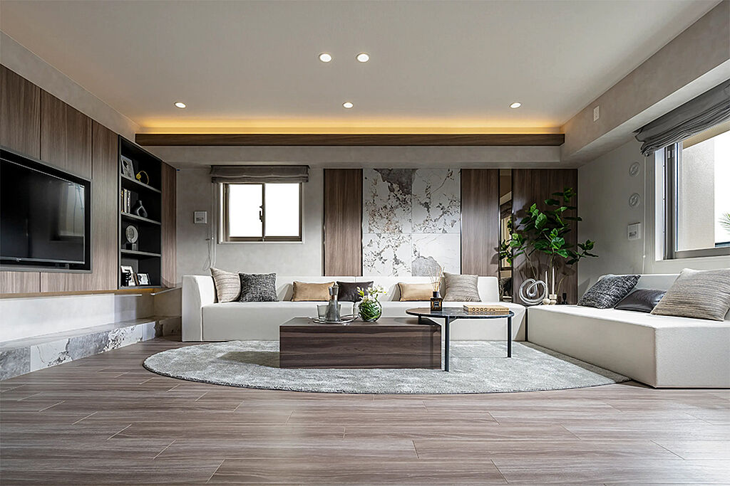 2層吹抜けの開放感あふれるホール空間。木調格子の天井デザインが奥行きを生み出し、外の緑景へと視線を誘います。間接照明の柔らかな光が調和をもたらし、静けさと気品が調和した、豊かさを語る空間です。