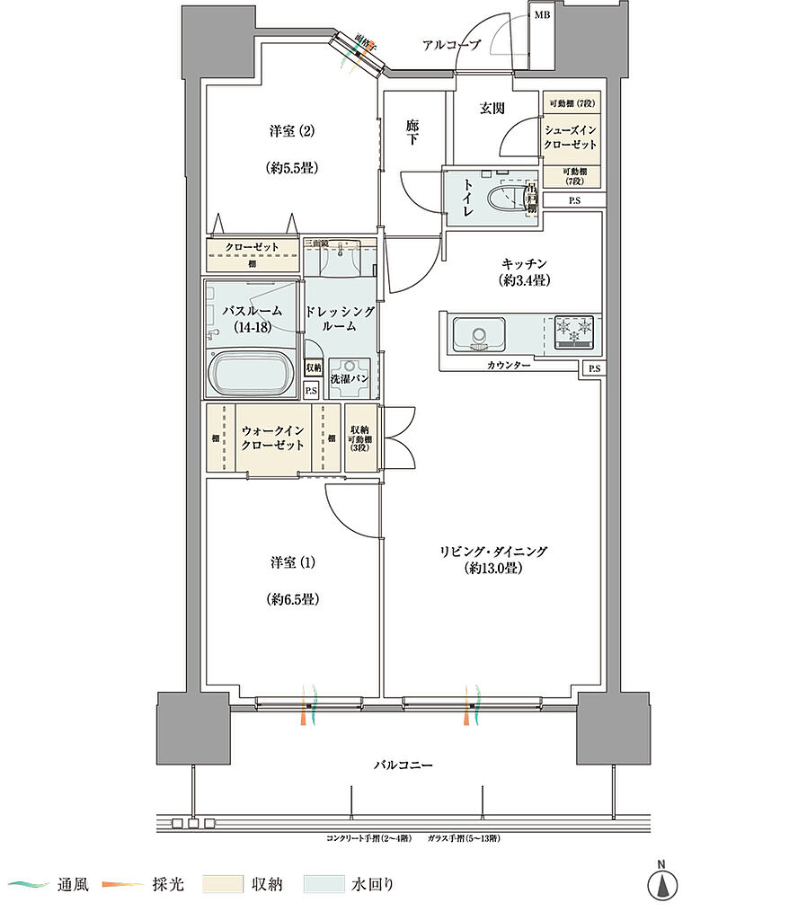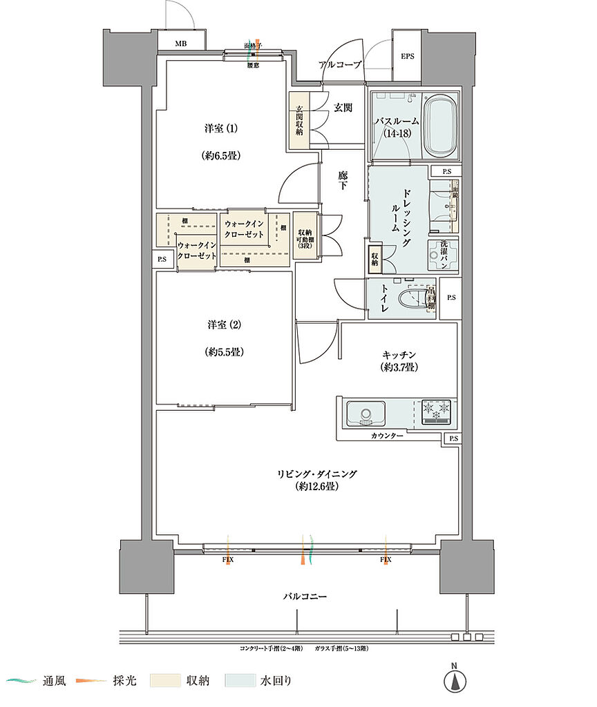 | 専有面積 | 65.38㎡・67.66㎡ | バルコニー面積 | 11.70㎡・12.06㎡ | ||