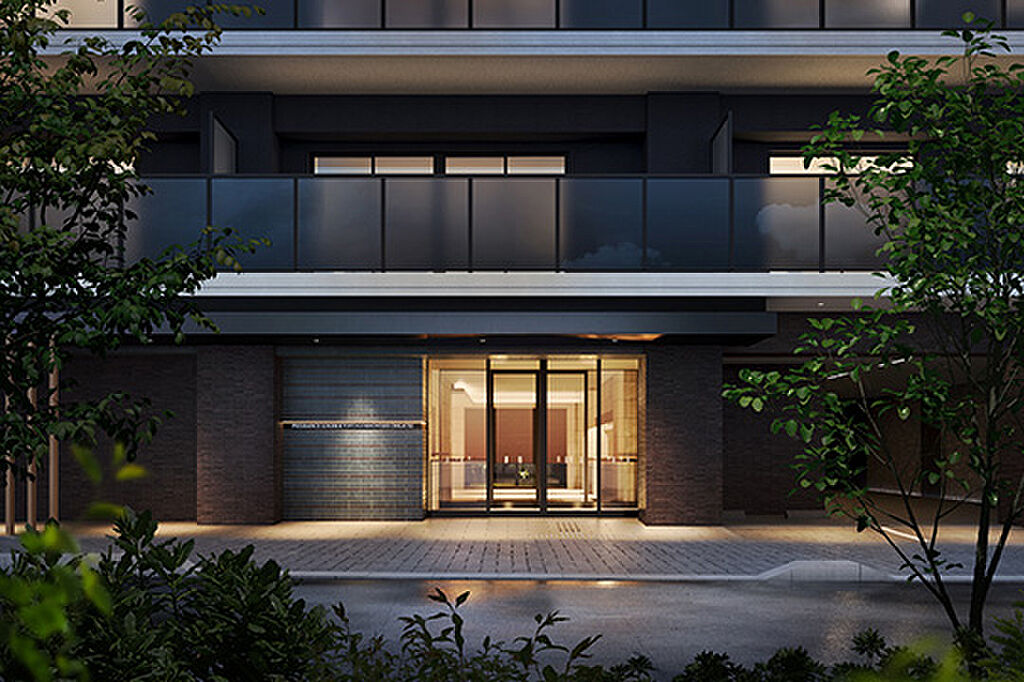 モダンでありながらも和の趣を感じさせるエントランスアプローチ。古都の風情を添える縦格子をモチーフとした木製ルーバーや、質感の高い壁面タイルなど、さまざまなマテリアルや意匠を織り上げて誇らかな空間を描きました。