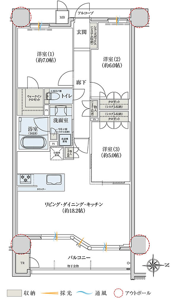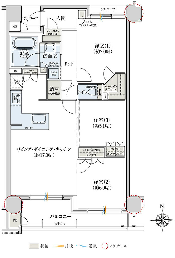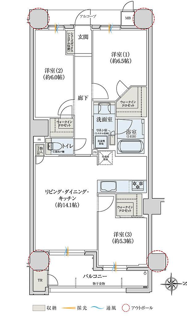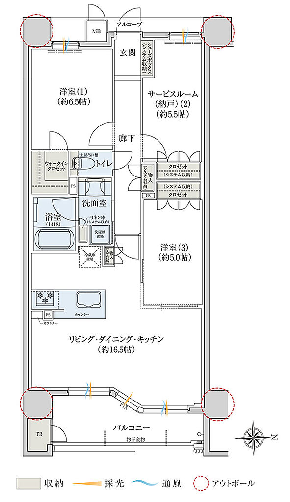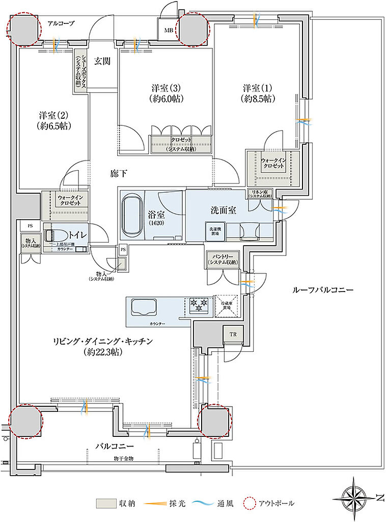| その他面積 | ■ルーフバルコニー面積/56.45㎡ ■サービスバルコニー面積/1.01㎡ ■室外機置場面積/3.33㎡ ■アルコーブ面積/2.30㎡~3.72㎡ | ||||