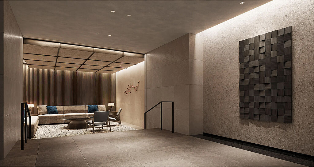 エントランスホールから続くラウンジスペースは、フロアに高低差をつけることで、落ち着いて過ごせる空間としての結界性を演出。ダウンライトと間接照明によるやわらかな光とともにやすらぎを満たします。
