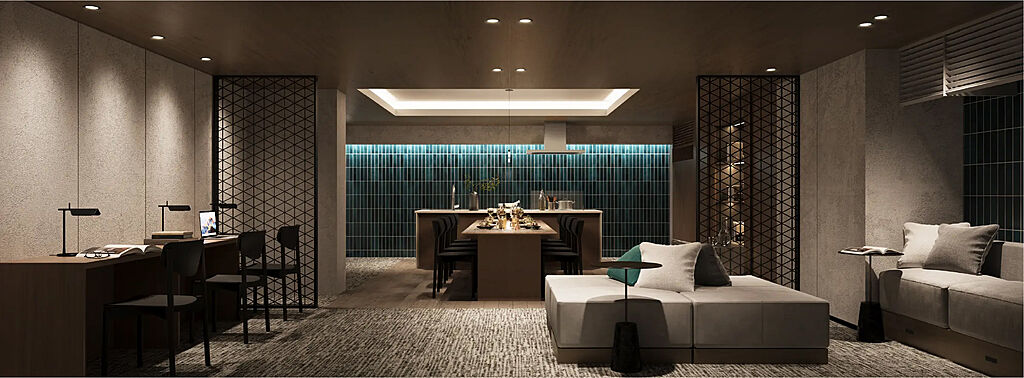 集会室を兼ねたキッチンラウンジには、気軽に腰かけられるビッグスツールや、ワークスペースとしても便利なカウンターデスクを配置。奥のキッチンエリアは、貸切や住民同士のパーティーにもご利用いただけます。