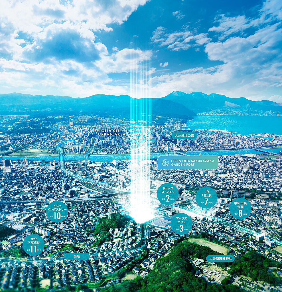 みえる世界は、理想を超える。エリア最大級※1・全88邸、美しい空と豊かな翠を抱くランドマークレジデンス始動。JR「大分」駅へ約3km圏で愉しむ優雅なひととき。美しい桜並木と煌めく翠に寄り添う静謐の「桜坂」。圧倒的な開放感を得る、南ひな壇の丘にめぐり逢えた奇蹟が、すべての人の暮らしを感動へと導いてゆく。永遠の愛が誓われた結婚式場跡地の歓びを受け継ぐ「レーベン大分桜坂 GARDEN FORT」ここからみえる世界は、あなたの理想を超える。