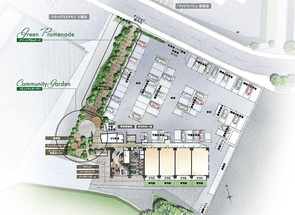 「マックスバリュ桜坂店」徒歩3分×「ドラッグストアモリ下郡店」隣接 ※1敷地内駐車場140%超 下郡エリア最大級・全88邸 ※2全10タイプ 平均専有面積77m2超、3・4LDK ※総戸数88邸に対しての内容を記載しております。