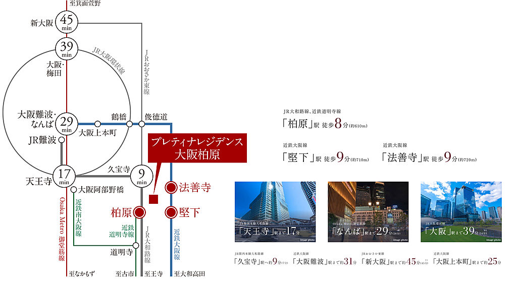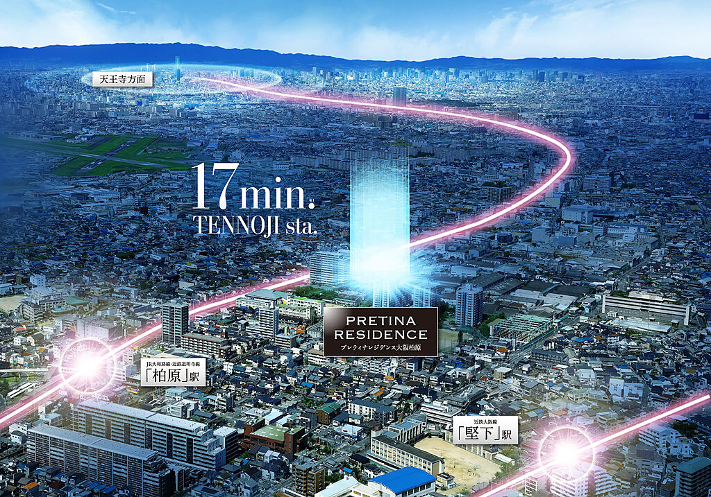 徒歩8分のJR「柏原」駅よりJR「天王寺」駅へ17分のダイレクトアクセス、3線3駅利用可能。全邸南向き・平面駐車場100台設置・多彩な共有空間とプランを採用した総131邸の大規模プロジェクト始動。