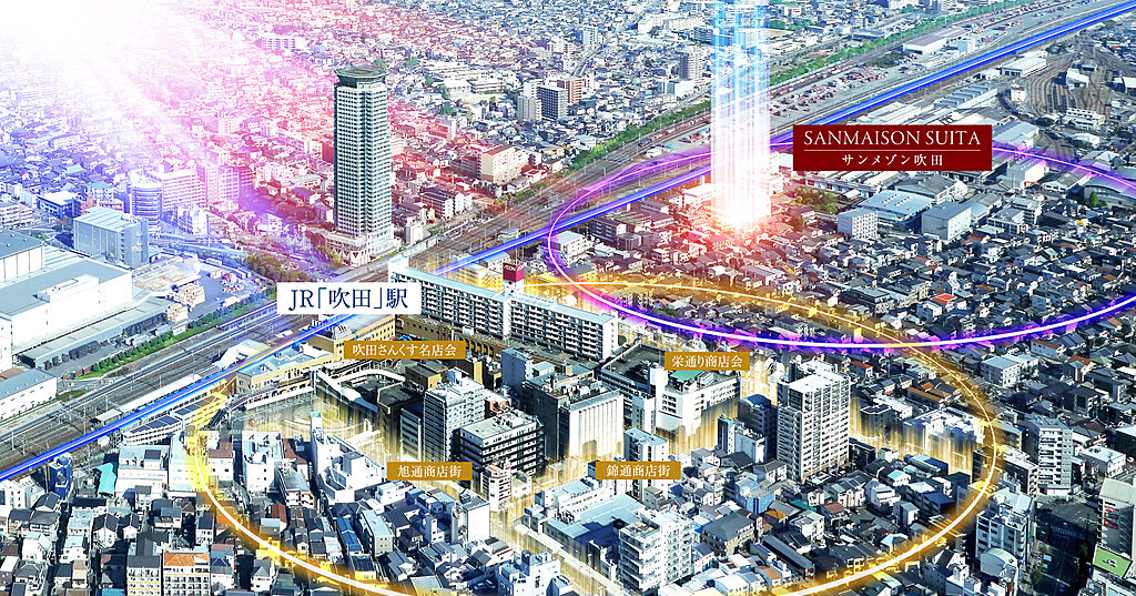【ポイント】 ※1.JR東海道本線「吹田」駅:約400m(徒歩5分)、阪急京都線「相川」駅:約1,160m(徒歩15分) ※2.吹田さんくす名店会:約420m(徒歩6分)、栄通り商店会:約370m(徒歩5分)、錦通商店街:約530m(徒歩7分)、旭通商店街:約720m(徒歩9分)、新旭町通り商店街:約810m(徒歩11分)、吹田さんくす2番館・イオン吹田店:約420m(徒歩6分)、吹田さんくす1番館:約740m(徒歩10分) | ||||