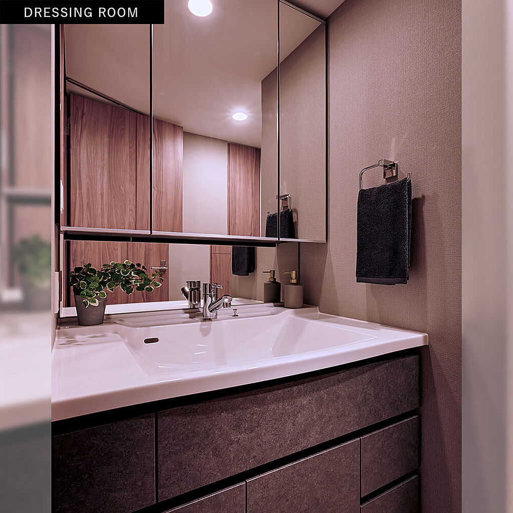 美しい存在感を放って街と調和する洗練のレジデンス。南西面のファサードは、バルコニーのガラス手摺りが陽光にきらめく開放感にあふれたデザイン。白のマリオンをアクセントに、端正な表情で住まう人をやさしく迎えます。街の景観と調和するよう、落ち着きあるベージュを基調として素材の質感が醸し出す美しい存在感を追求。空が広く眺望の心地よさを纏いながら、上質な印象を感じさせるレジデンスです。