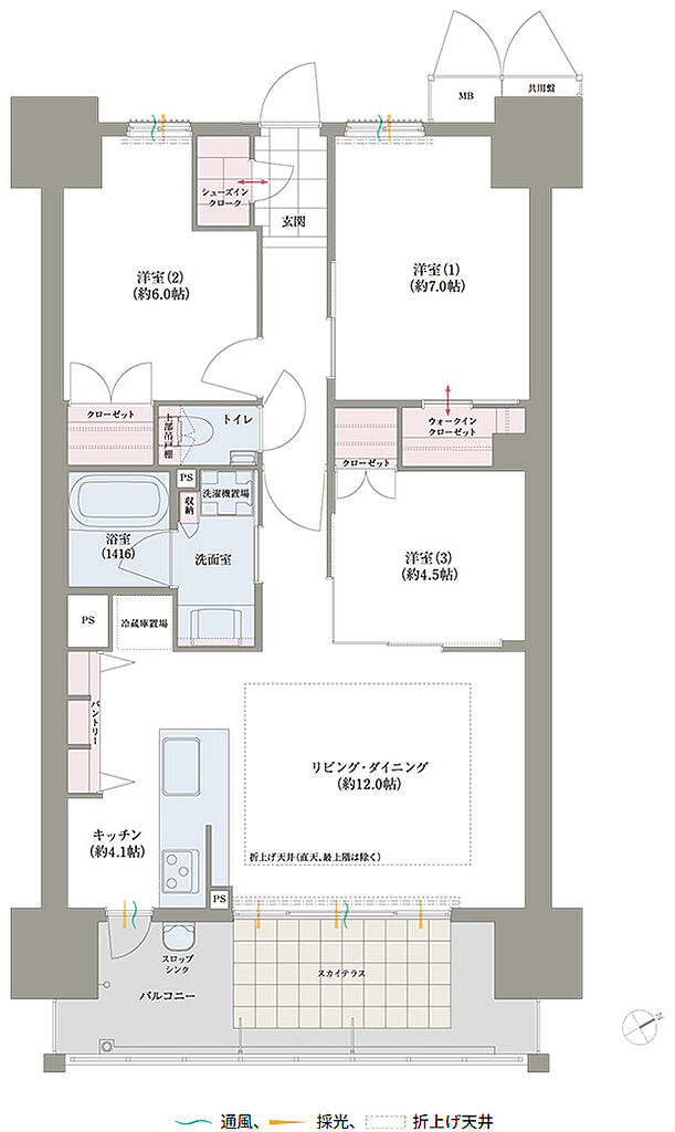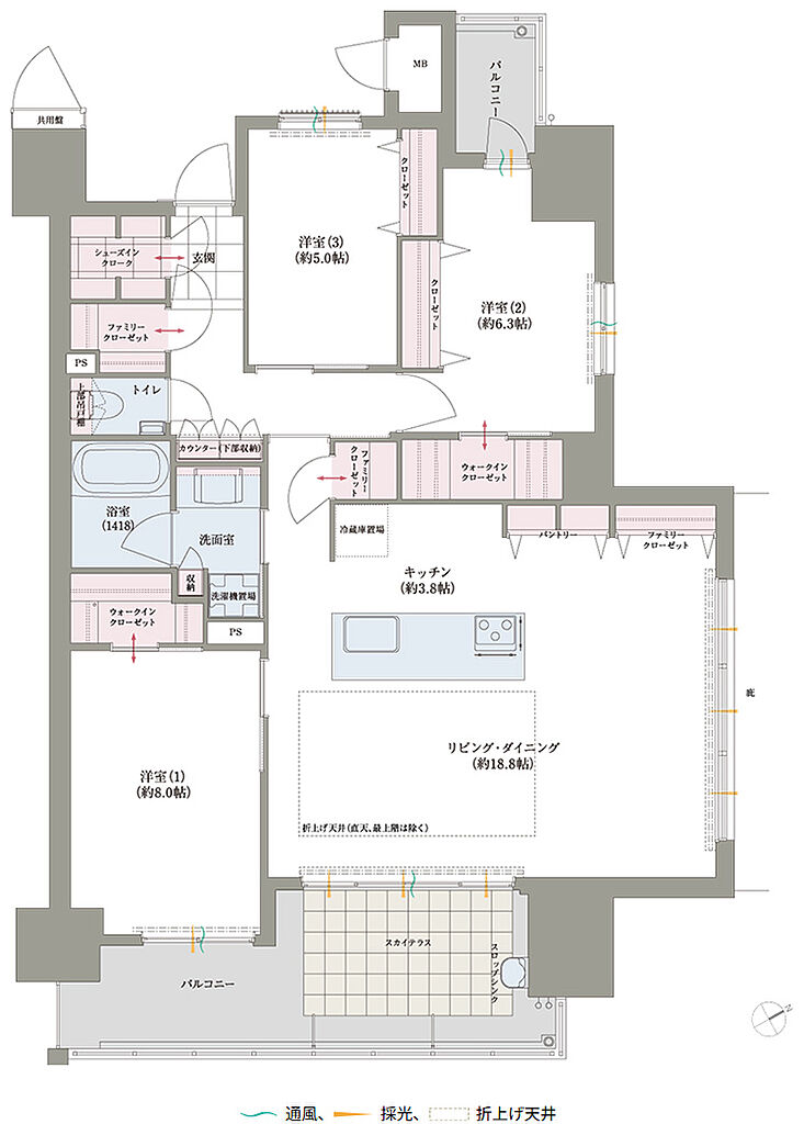 | 専有面積 | 57.23㎡~120.36㎡ | バルコニー面積 | 12.40㎡~48.15㎡(スカイテラス面積含む) | ||