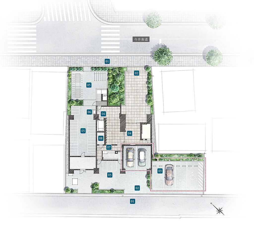 【1】南西側と北東側の2面接道【2】安心の歩車分離設計【3】全区画EV充電対応平置き駐車場【4】トリプルセキュリティ【5】敷地内駐輪場72台分、バイク置場3台分【6】ペット足洗い場【7】宅配ボックス・メールボックス【8】防災備蓄倉庫