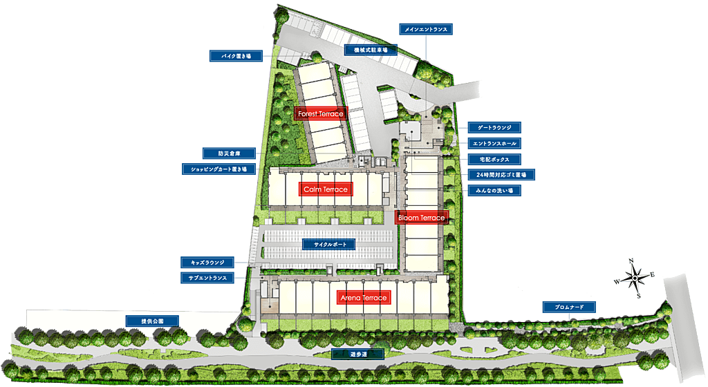 春は花が咲き、夏は緑が色濃く染まる豊かな四季を敷地計画で演出しました。4つの住棟を様々な花木で包み、目前に続く遊歩道と呼応するアプローチや提供公園を計画。自然の安らぎを実感する日常がここに始まります。
