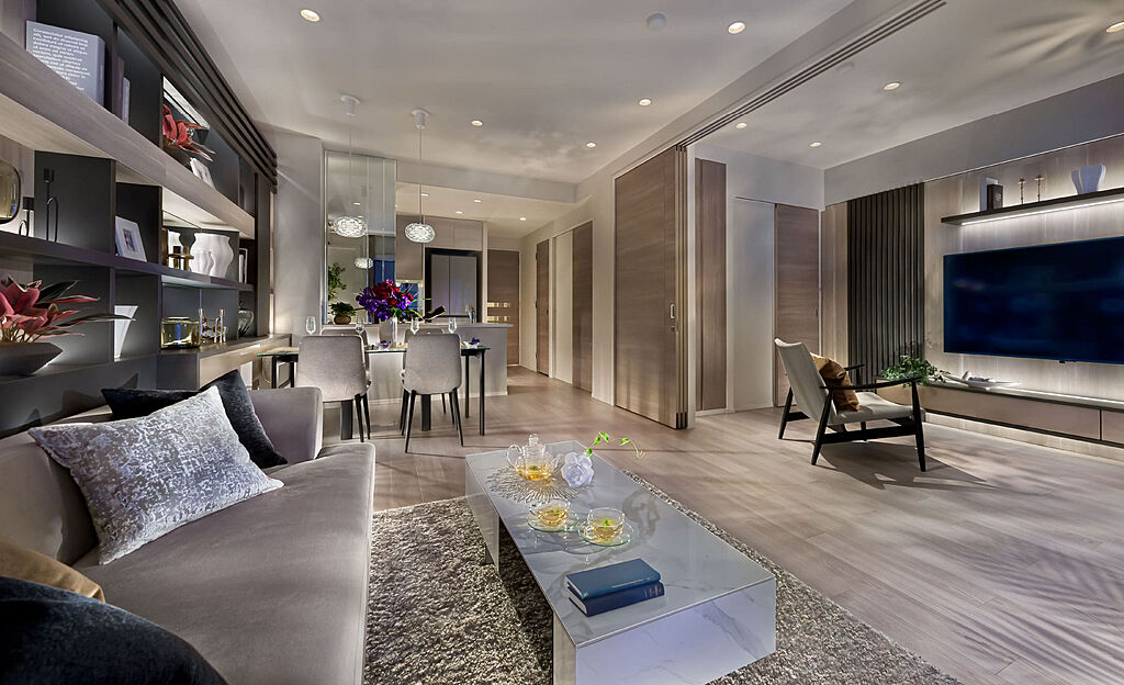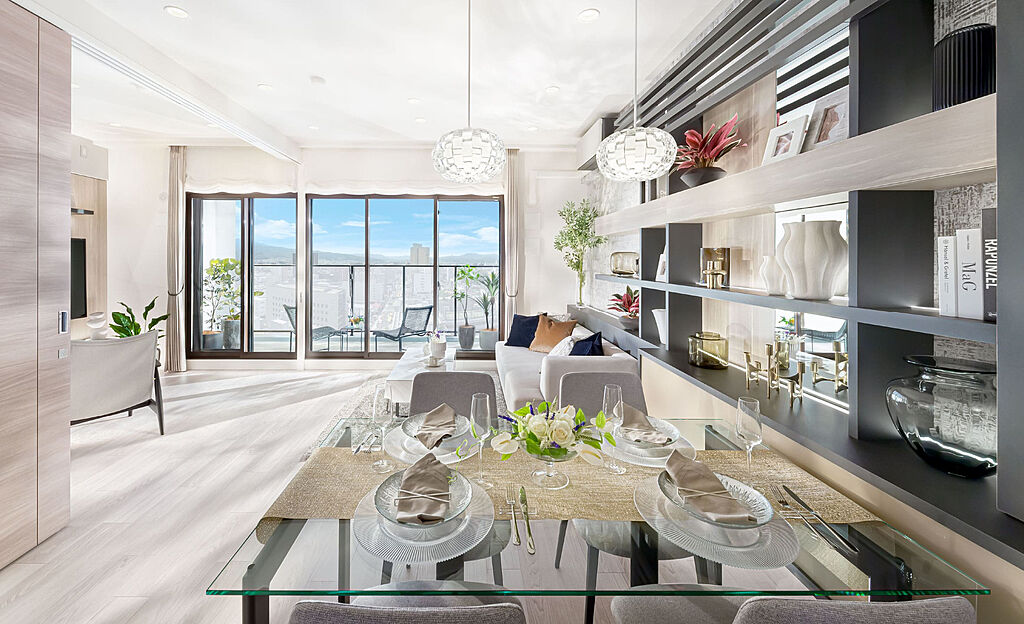 ライフスタイルに合わせて間取りを変更できるフレキシブルプラン洋室の可動式間仕切り扉を開放することで、リビング・ダイニングと一体利用ができるプランを採用しました。リフォームすることなく、間取りを変更できるので、ライフスタイルの変化に自在に対応できます。また、間仕切り扉を室内側に収納でき、窓面には余計な袖壁がないため、より開放的な一体感が得られます。