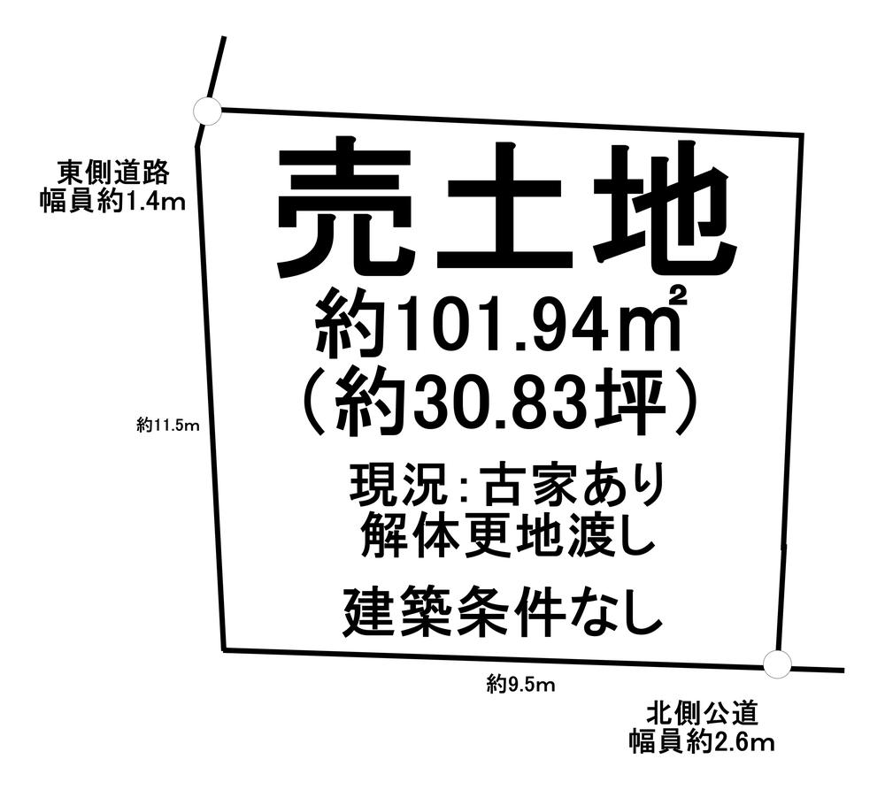 | 建ぺい率・容積率 | 60%・150% | 私道負担・道路 | 無、北2.6m幅(接道幅9.5m)、東1.4m幅(接道幅11.5m) | ||