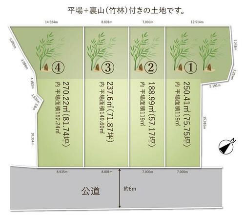 | 備考 | 【法令制限】都市機能誘導区域居住誘導区域、景観法、国土利用計画法、都市再生特別措置法、森林法、高さ制限(10m)、道路斜線制限、北側斜線制限、日影制限【物件概要】平場面積+裏山(竹林)付の土地です。1号地:1,250万円 250.41㎡ (119㎡ 36坪 +131㎡ 39坪) 2号地:1,250万円 188.99㎡(119㎡ 36坪 +70㎡ 21坪) 3号地:1,580万円 237.60㎡(149㎡ 45坪 +88㎡ 26坪)4号地:1,580万円 270.22㎡(152㎡ 46坪 +117㎡ 35坪)※2、3区画同時購入も可能・楽しい裏山付き◆南東道路で日当たり良好◆道路より2m高い敷地◆買い物施設や銀行が近く生活便利◆最寄駅まで徒歩8分で通勤通学に便利◆徒歩圏内に文教施設が充実◆保育園まで約320m | ||||