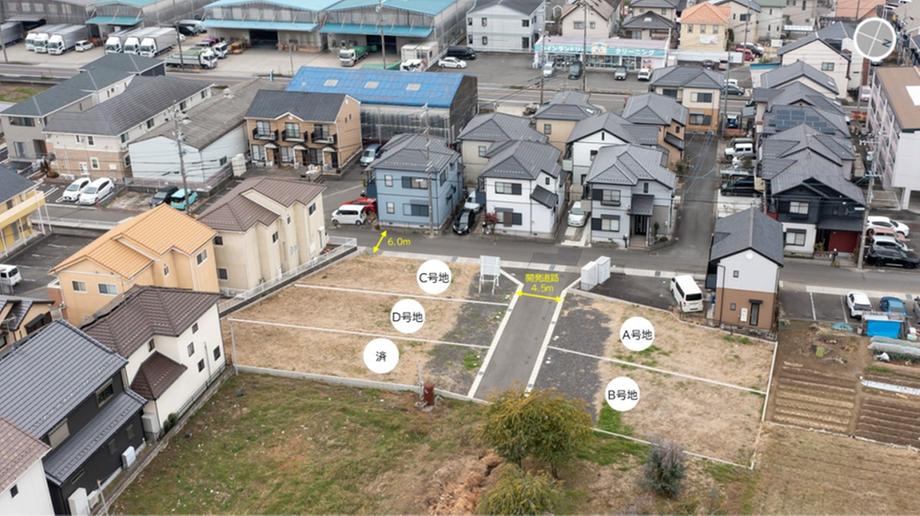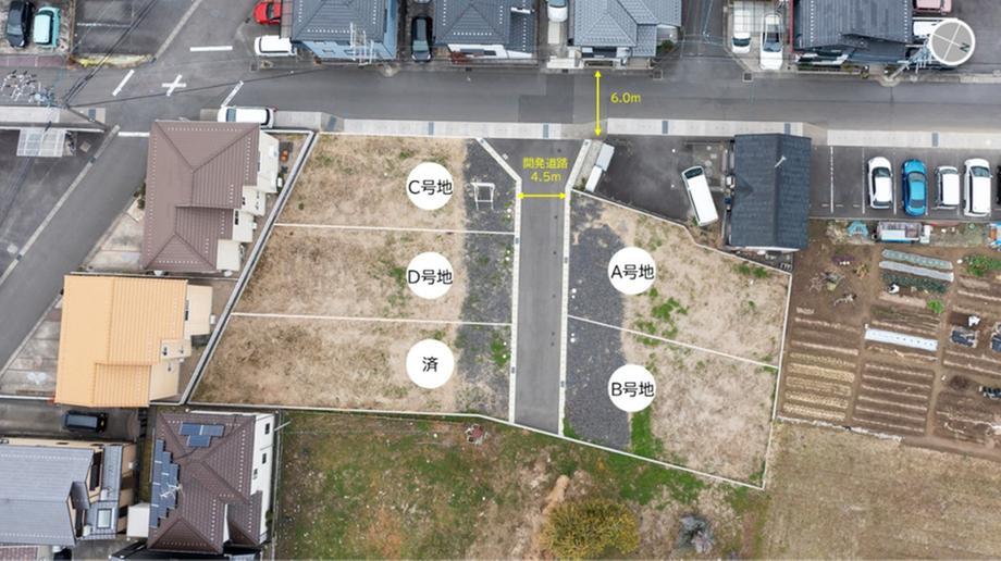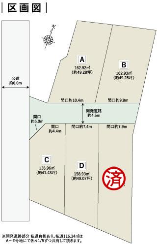 | 建ぺい率・容積率 | 建ぺい率:60/容積率:179.20 | 私道負担・道路 | 道路幅:4.5m、アスファルト舗装、私道負担/開発道路部分あり。私道116.34㎡はA~E号地にて各々1/5ずつ共有していただきます。 | ||