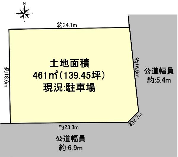 | 建ぺい率・容積率 | 60%・200% | 私道負担・道路 | 無、南6.9m幅(接道幅23.3m)、東5.4m幅(接道幅16.6m) | ||