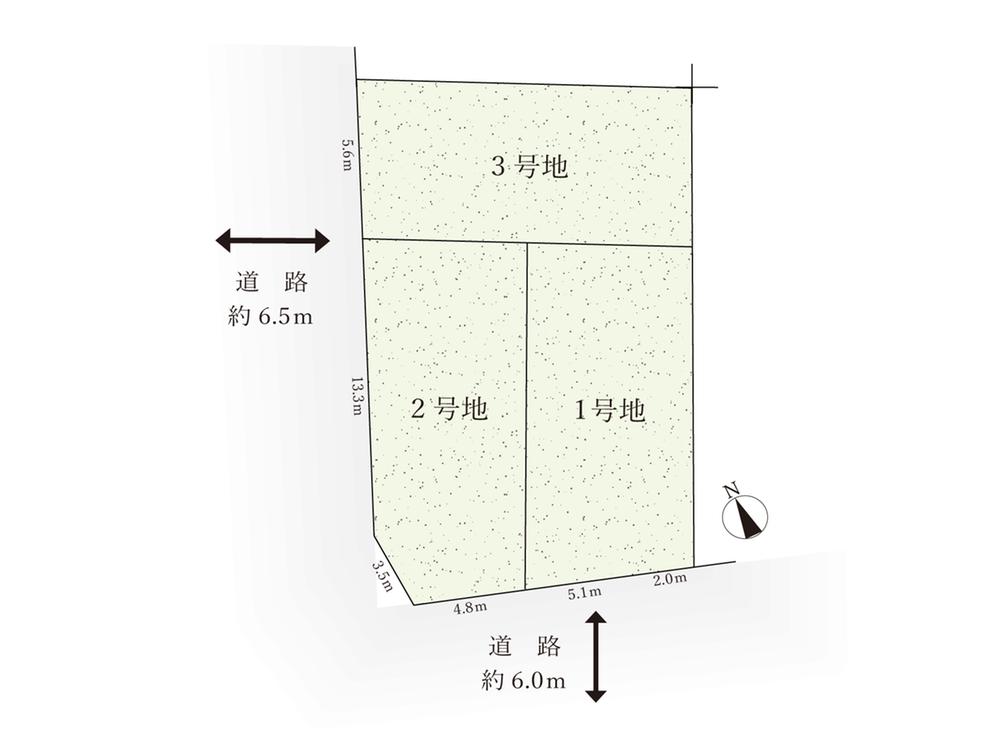| 建ぺい率・容積率 | 建ぺい率:60%、容積率:150% | 私道負担・道路 | 道路幅:6m~6.5m、私道負担なし、南側幅員約6.0m、西側幅員約6.5mの公道に接する | ||