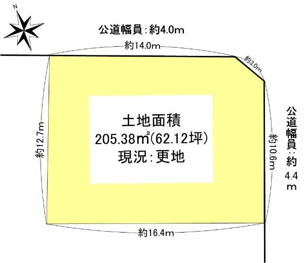 | 建ぺい率・容積率 | 40%・100% | 私道負担・道路 | 無、北東4m幅(接道幅14m)、南東4.4m幅(接道幅10.6m) | ||