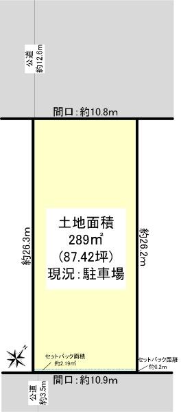 | 建ぺい率・容積率 | 60%・200% | 私道負担・道路 | 無、南東3.5m幅(接道幅10.9m)、北西12.6m幅(接道幅10.8m) | ||